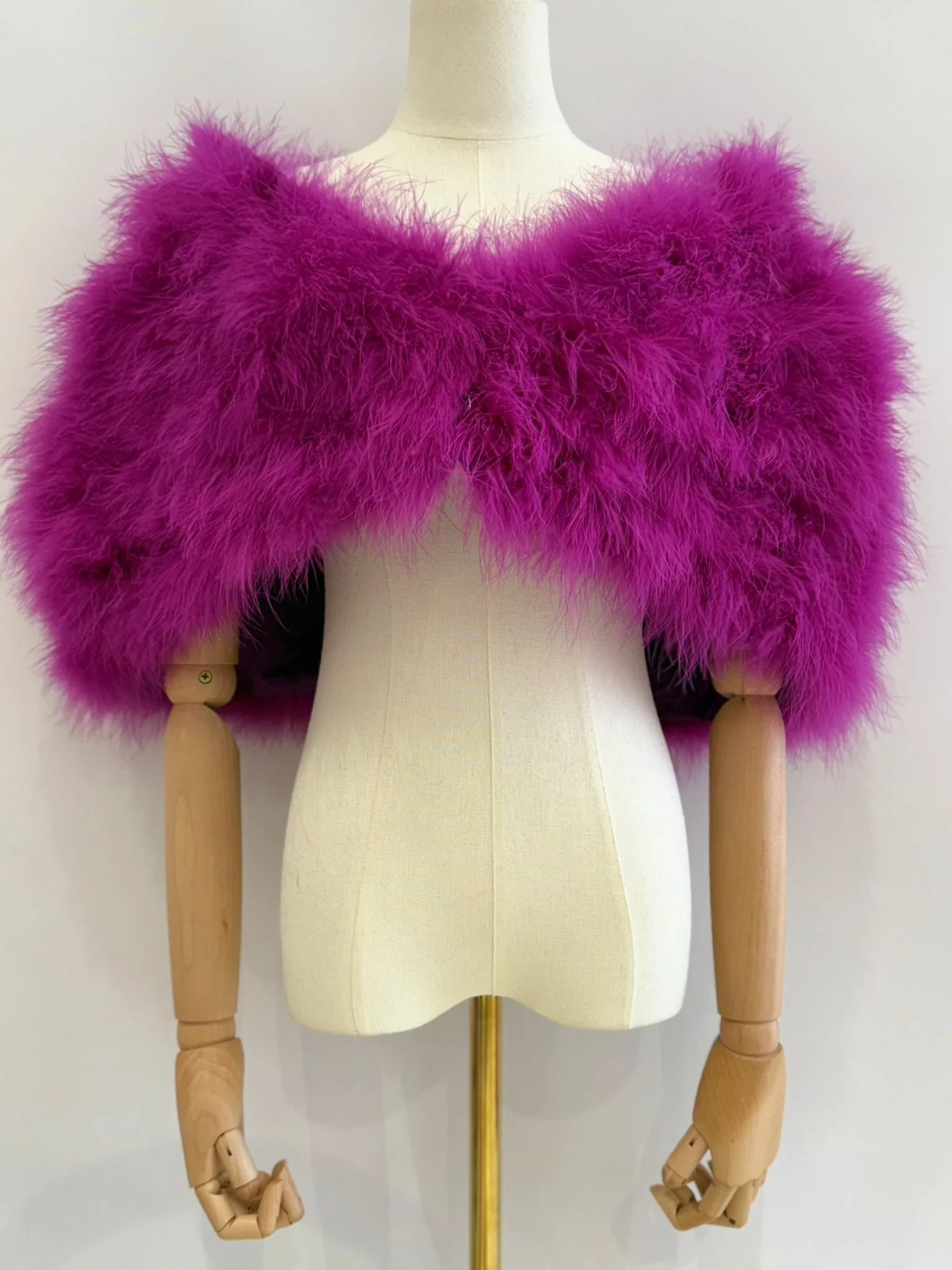 Capa de plumas fucsia confeccionada en más de 10 colores diferentes. Ideal para las invitadas de otoño/invierno y principios de primavera. Uno de los top ventas cada temporada que darán a tu look ese toque especial. Muy ligeras, con dos cierres en la parte frontal para mayor comodidad a la hora de llevarlas. Corre y compra ya tu capa, porque se agotan muy rápido