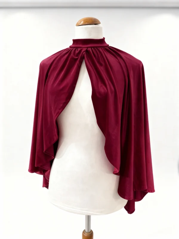 Capa de terciopelo corta granate disponible en 8 colores diferentes. Cerrada al cuello con botones, desde le centro de ese cuello sale en pico inverso toda la capa, la cual es de largo asimétrico más larga en la espalda. Ideal para las invitadas a eventos que quieran abrigarse con estilo.