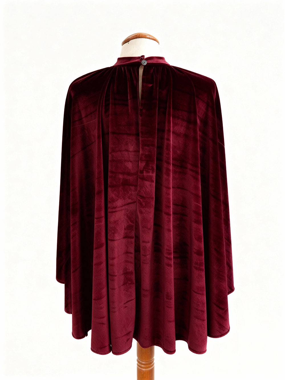Capa de terciopelo corta rosa disponible en 8 colores diferentes. Cerrada al cuello con botones, desde le centro de ese cuello sale en pico inverso toda la capa, la cual es de largo asimétrico más larga en la espalda. Ideal para las invitadas a eventos que quieran abrigarse con estilo.