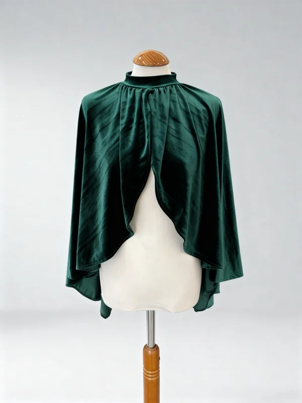Capa de terciopelo corta verde disponible en 8 colores diferentes. Cerrada al cuello con botones, desde le centro de ese cuello sale en pico inverso toda la capa, la cual es de largo asimétrico más larga en la espalda. Ideal para las invitadas a eventos que quieran abrigarse con estilo.