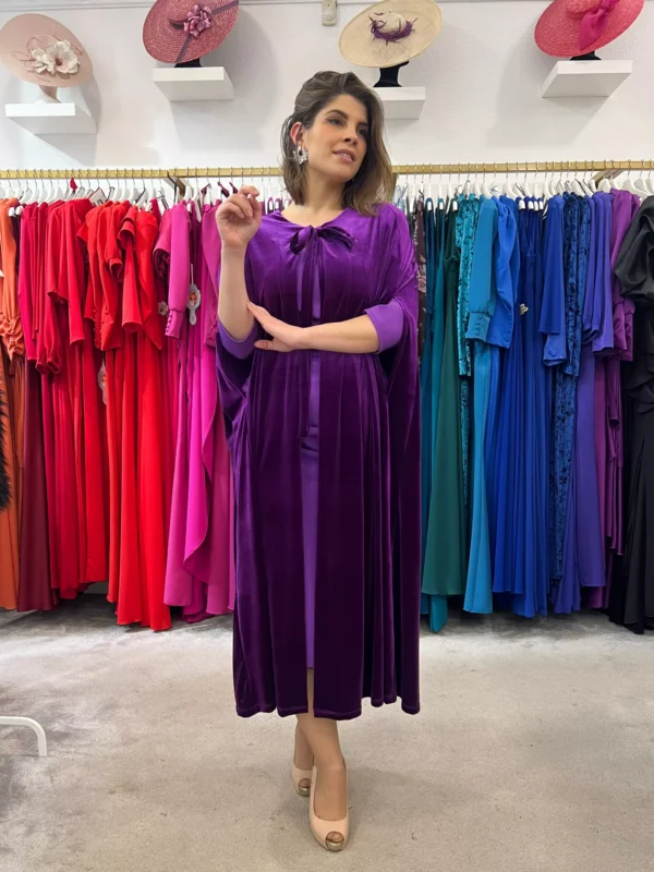 Capa de terciopelo larga disponible en 6 colores diferentes. Escote cerrado con lazada y aberturas en medio de la capa por las que podrás pasar los brazos