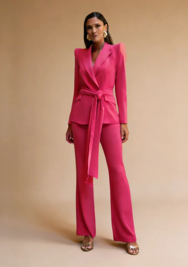 Conjunto de pantalón en tejido crepé en tono fresa con chaqueta de corte estructurado y escote cruzado. Incorpora una lazada de gasa en la cintura que suaviza el conjunto y aporta movimiento, creando un efecto elegante y muy favorecedor. Ideal para invitadas que buscan un look sofisticado con un toque femenino.