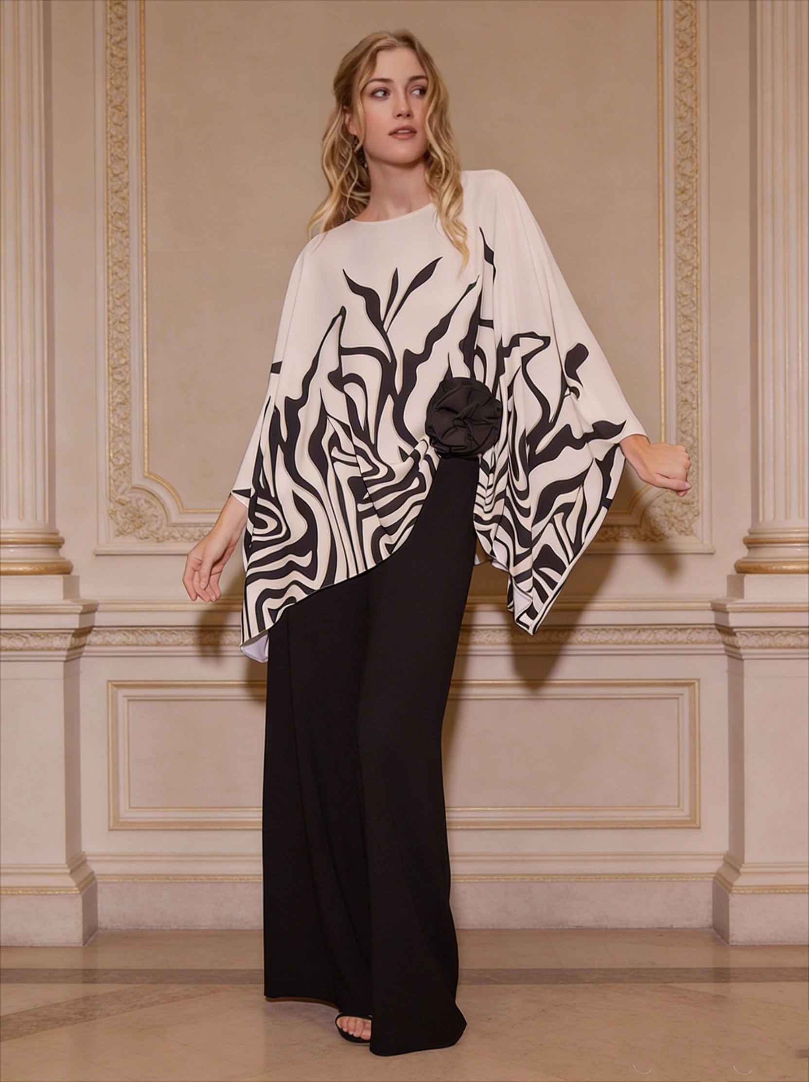Conjunto de dos piezas confeccionado en crepé, formado por pantalón negro de pernera ancha y blusa asimétrica estampada. Su diseño fluido aporta comodidad y movimiento, mientras que el detalle floral en la cintura añade un toque sofisticado. Una opción elegante y versátil para invitadas que buscan una alternativa al vestido.