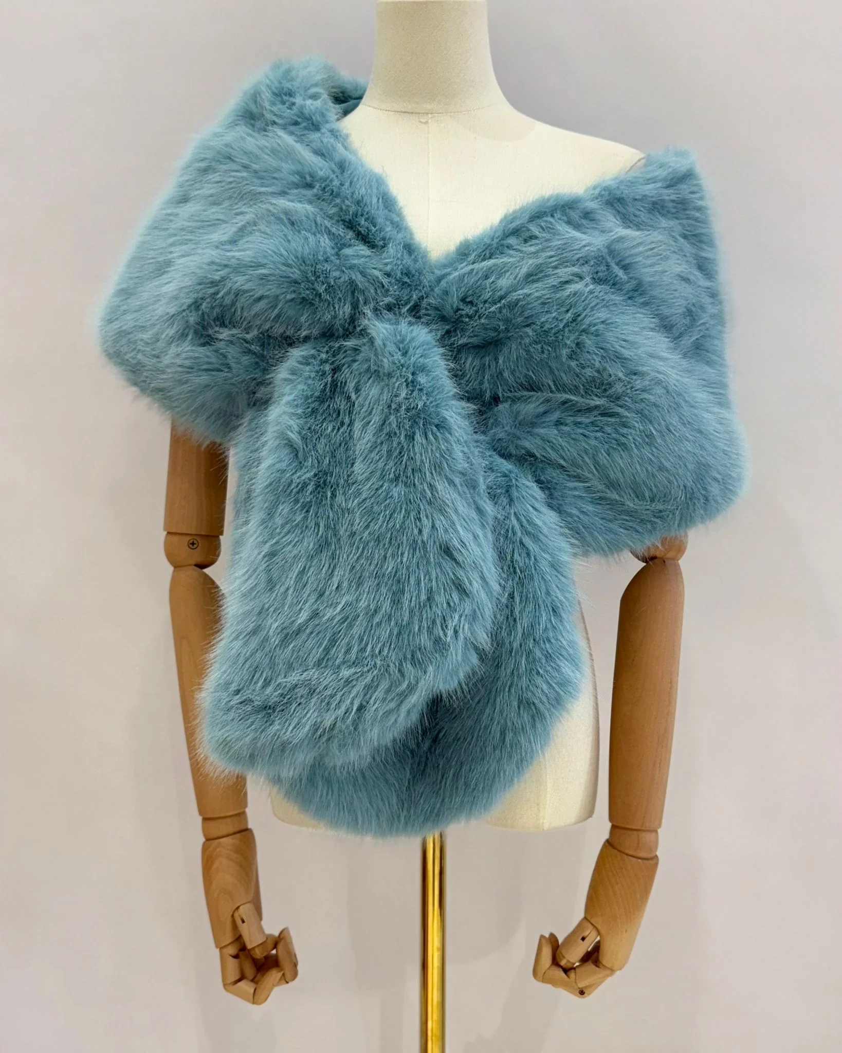 Estola de pelo azul claro ideal para invitadas de boda de otoño-invierno disponible en 14 colores diferentes. Para poner tanto cubriendo ambos brazos como sobre un hombro, dispone de un gancho para cruzarla. Es muy favorecedora, de pelo sintético muy suave y agradable que le dará ese toque especial a tus looks. Talla única
