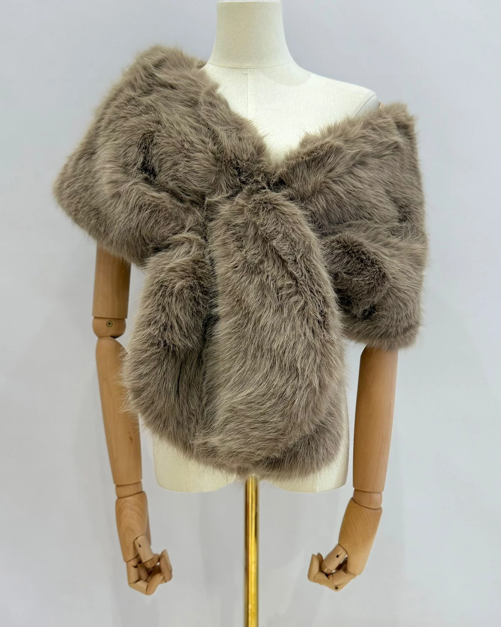Estola de pelo marrón claro ideal para invitadas de boda de otoño-invierno disponible en 14 colores diferentes. Para poner tanto cubriendo ambos brazos como sobre un hombro, dispone de un gancho para cruzarla. Es muy favorecedora, de pelo sintético muy suave y agradable que le dará ese toque especial a tus looks. Talla única