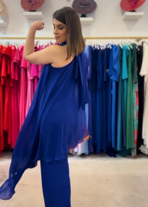 Mono de fiesta con sobrefalda confeccionado en gasa de color teja, verde botella y azulón. Cuerpo con escote pico en delantero y espalda, sin mangas y cintura plisada. Pantalón amplio de campana con forro de punto. Sobrefalda de gasa con abertura delantera que hace efecto visual de vestido cuando estás quieta. Elegante y cómodo