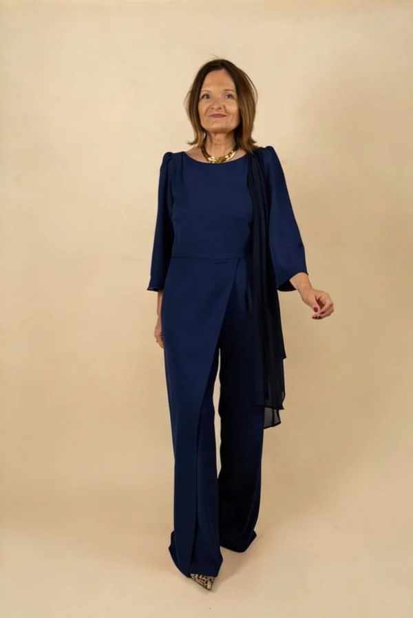 Mono largo en tono azul marino, con diseño fluido y elegante que estiliza la silueta sin marcar. Su corte limpio y el detalle de capa lateral aportan movimiento y sofisticación, convirtiéndolo en una opción perfecta para invitadas que buscan un look impecable y cómodo. Detalle de gasa al hombro.