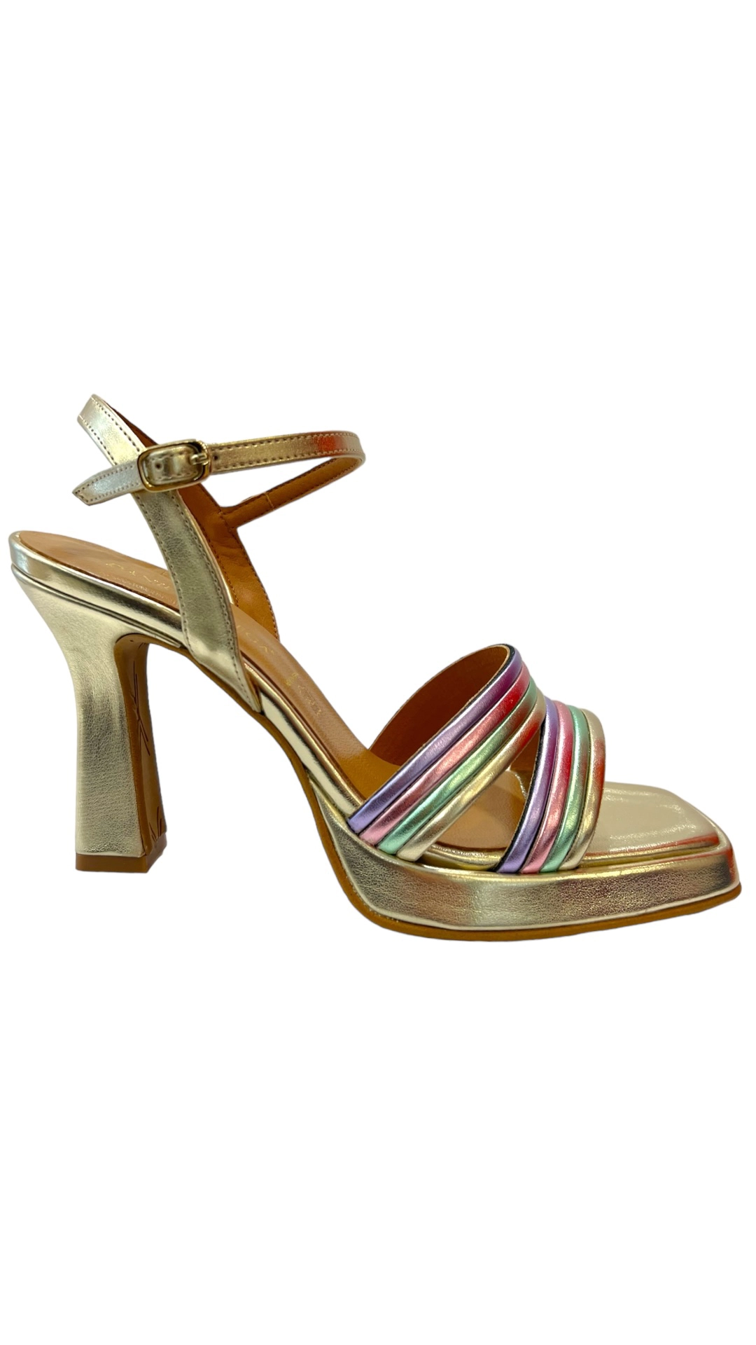 Sandalias doradas con tiras multicolor en tonos suaves. Ideales para tus eventos gracias a su estilo y comodidad. Sus dos tiras disponen de tonos metalizados rosa palo, verde menta, malva… que aportan gran sujeción al pie además de la pulsera del tobillo. Plataforma cuadrada en la parte delantera de 1,5 cm que aporta gran comodidad a la pisada y tacón medio, estilo cubano, más estrecho en la parte media que en la parte baja de 9 cm.