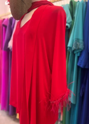 Conjunto rojo de pantalon y blusa con plumas