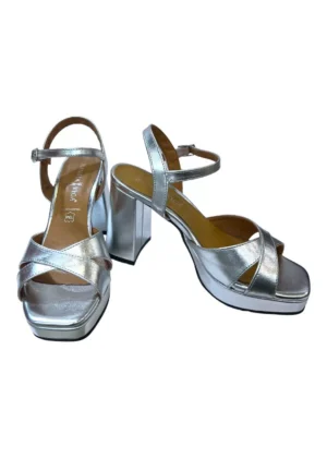 Sandalia de tiras cruzadas con tacón medio plateado