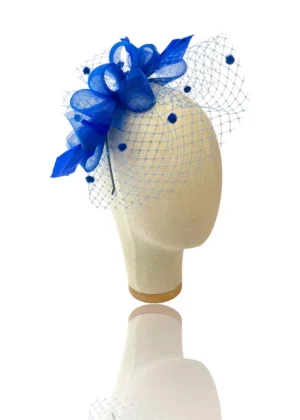 Tocado de bodaa Nora azul confeccionado a mano. Un tocado para invitadas de boda u otros eventos con base de diadema plateada, personalizable en negro o dorado. Confeccionado en crin de color azul formando nudos, a su vez decorado con un velo en tono plata