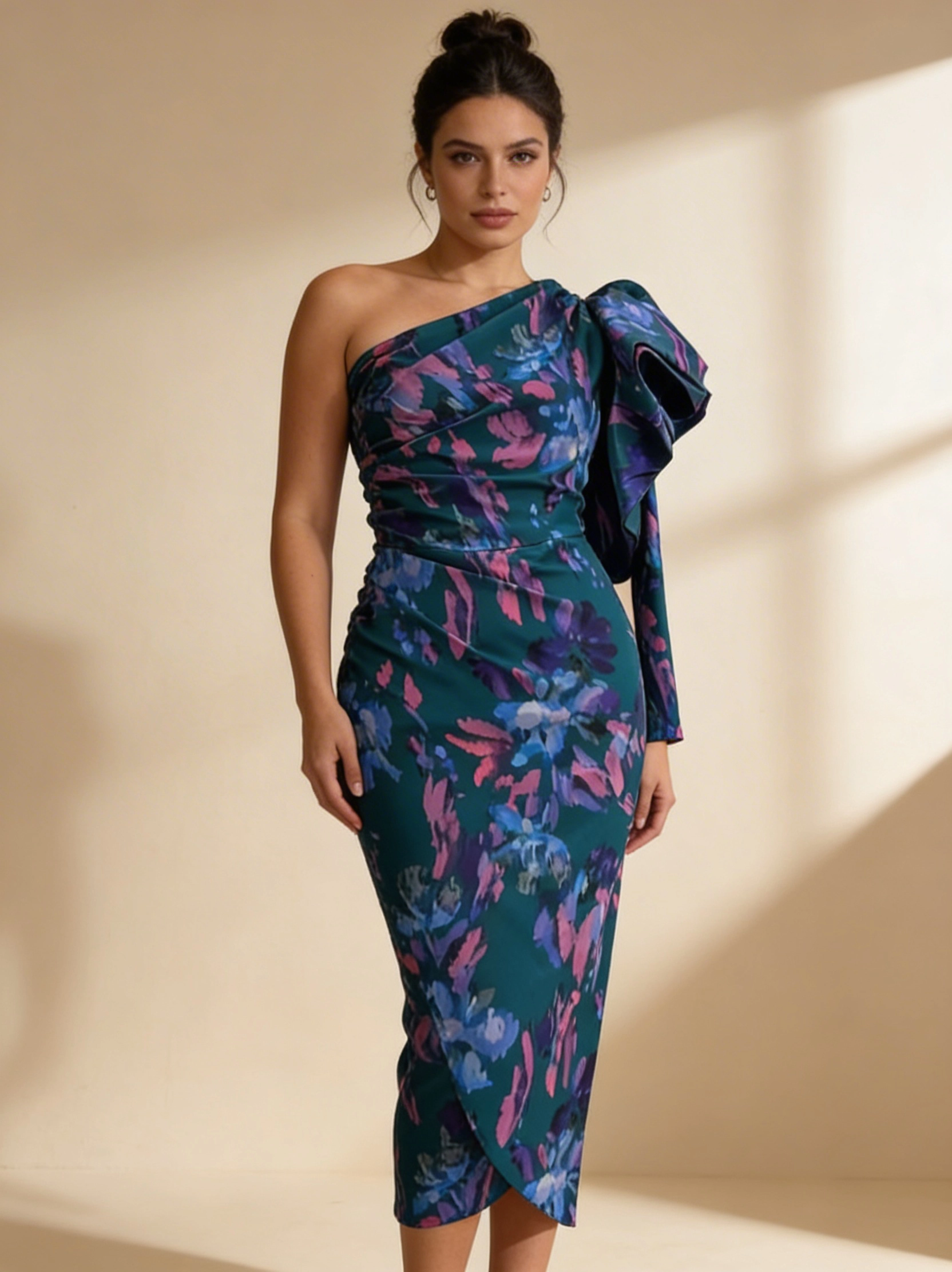Vestido asimétrico estampado con maxi volante confeccionado en crepe de color verde esmeralda con flores color morado y rosas. Falda cruzada con bajo redondeado y drapeado en el lateral derecho. Escote asimétrico con manga en el brazo izquierdo y cremallera en la espalda. Tiene una hechura muy favorecedora dado a que no marca tanto la zona del vientre a la vez de aportar mayor comodidad.