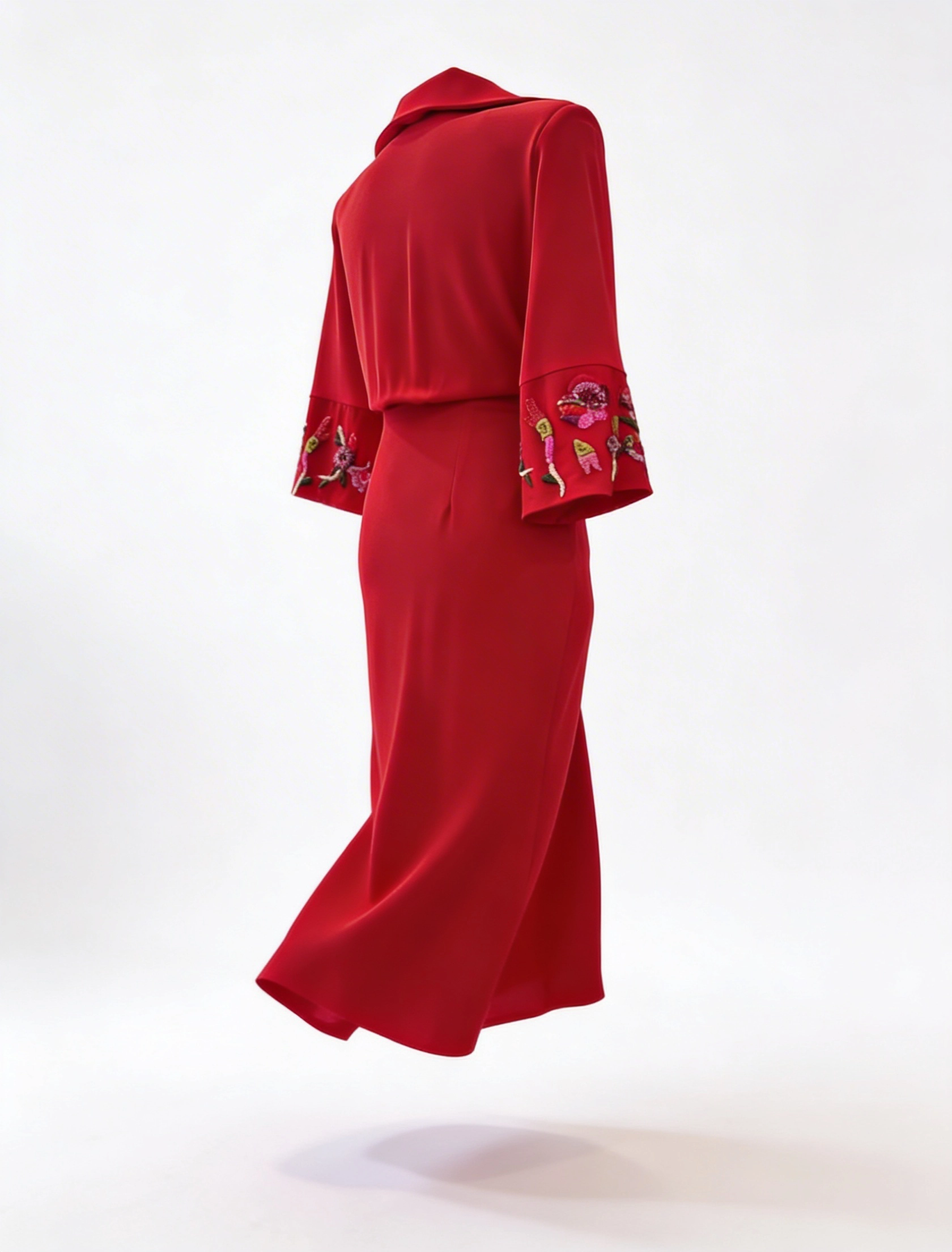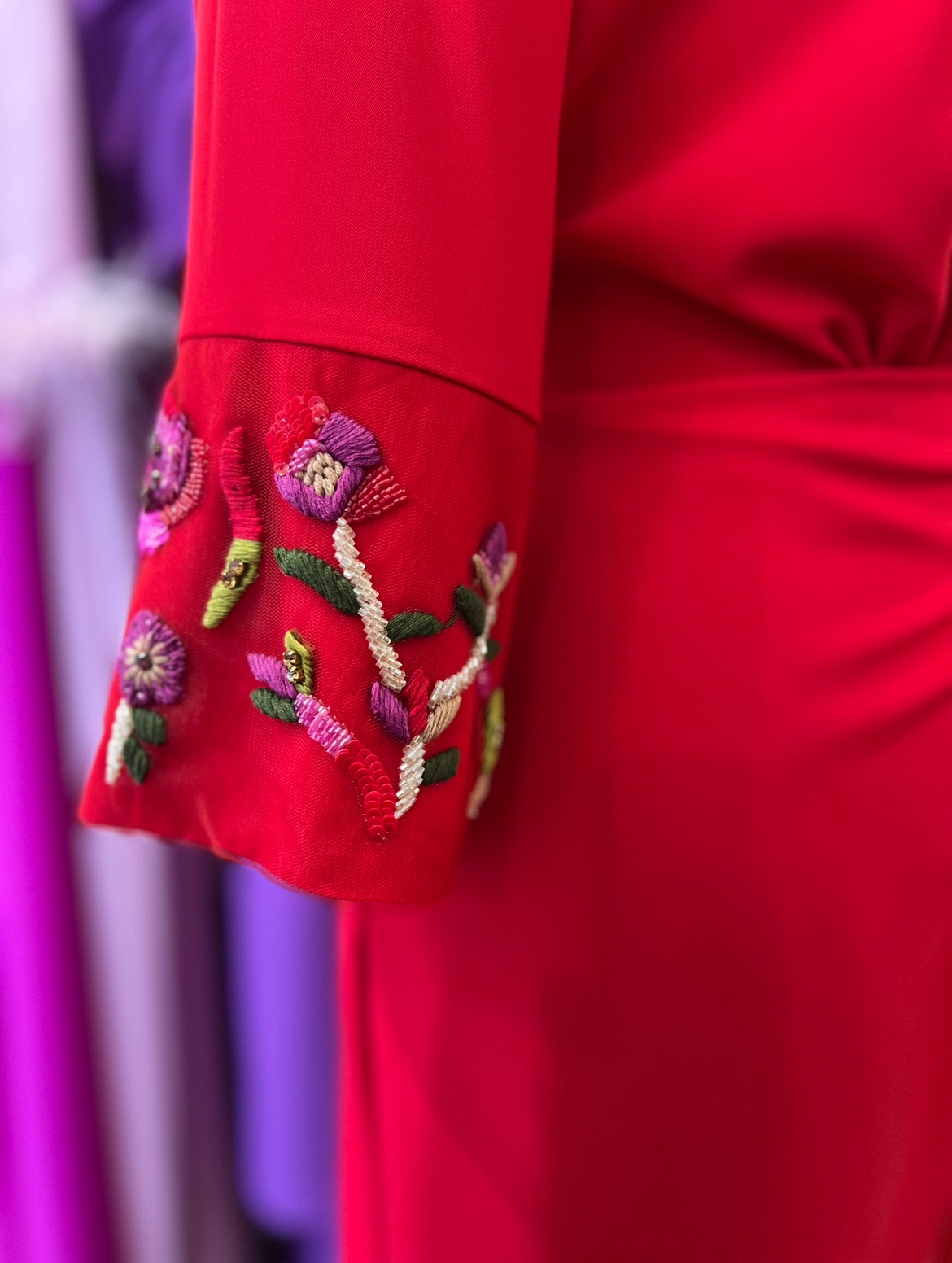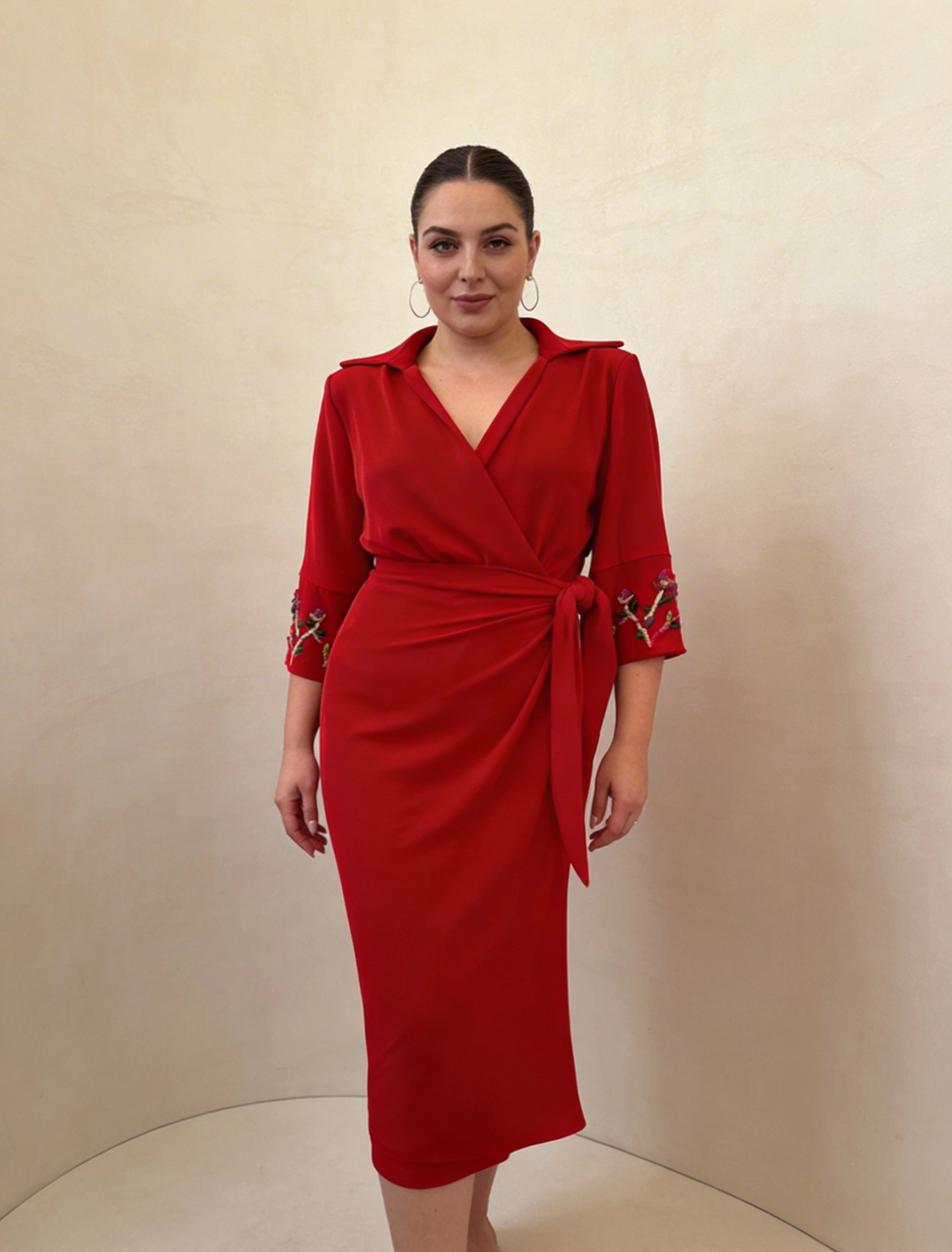 Vestido camisero rojo con puño bordado confeccionado en crepe fluido. Hechura con escote pico y cuello de solapa estilo camisa. Nudo en la cintura y manga tres cuartos acampanada. En el final del puño lleva un tul bordado con detalles multicolor. Diseñado y confeccionado en España