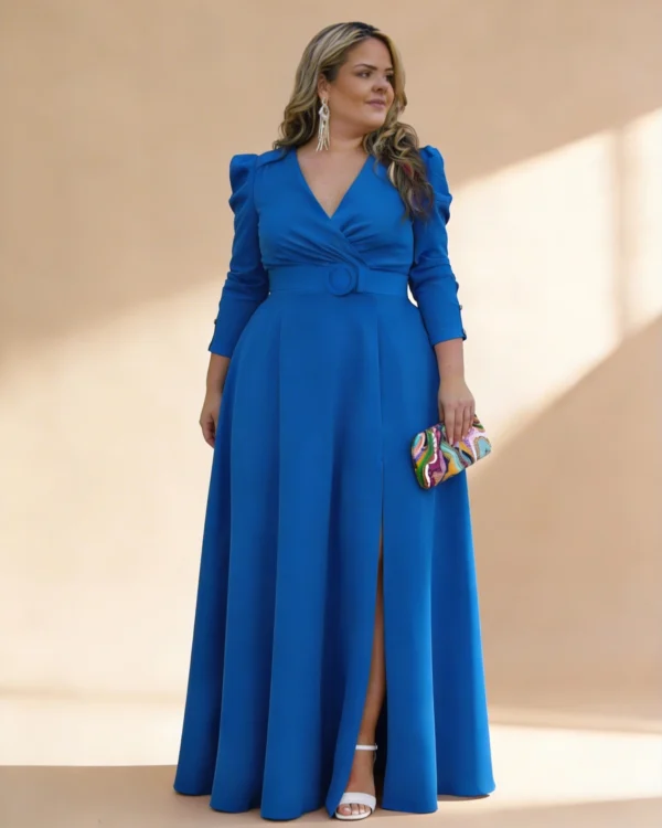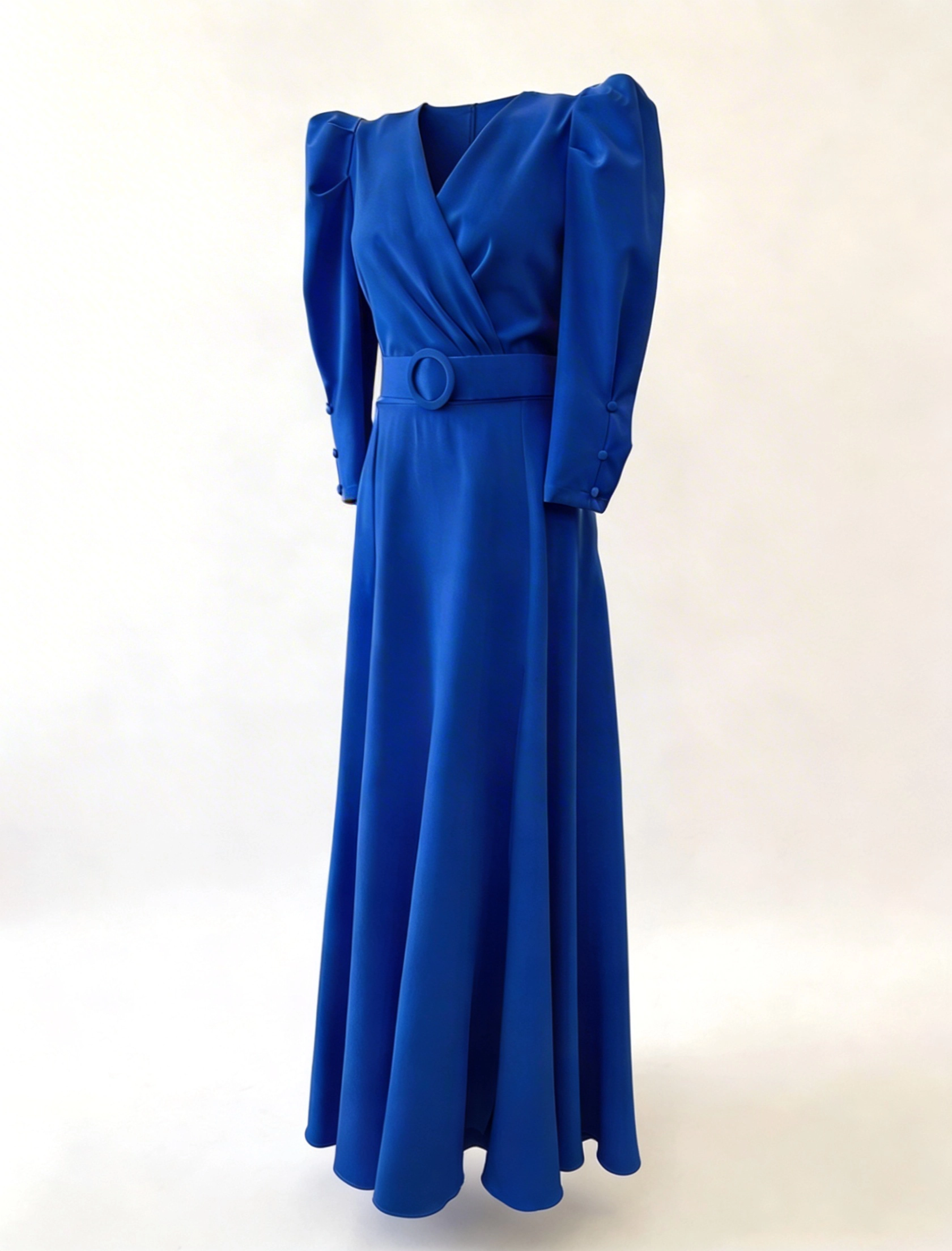 Vestido de fiesta largo azul tinta con falda de vuelo confeccionado en crepe. Escote cruzado con manga larga abullonada decorada con botones forrados, falda de capa con bolsillos y abertura sobre la pierna izquierda. Cinturón forrado con la misma tela. El vestido ideal para ser la invitada perfecta este otoño invierno, su hechura sienta bien a todo tipo de cuerpos.