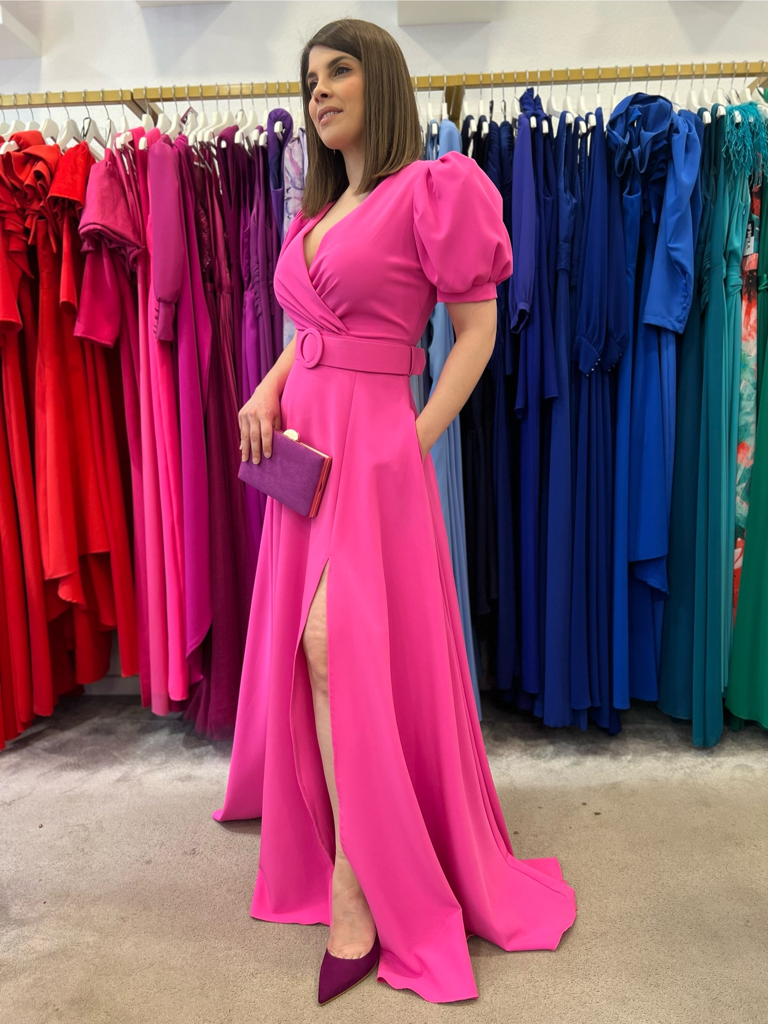 Vestido de fiesta largo con manga farol. Vestido confeccionado en crepe color coral. Cuerpo con escote pico cruzado y manga corta abullonada. Ésta está decorada con un puño estrecho haciendo forma redonda a la manga tipo farol, falda de capa con bolsillos y abertura sobre la pierna izquierda. Cinturón forrado con la misma tela. El vestido ideal para ser la invitada perfecta, su hechura sienta bien a todo tipo de cuerpos y su tela moldea el cuerpo.