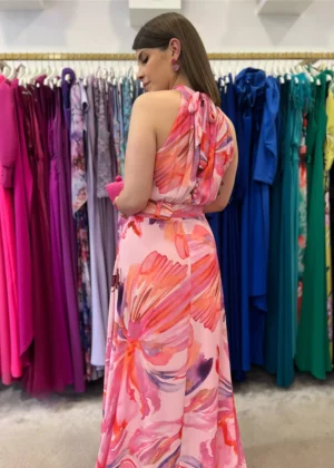 Vestido de fiesta largo drapeado con evassé coral confeccionado en crepe fino de alta calidad. Escote pico cruzado el delantero, que acompaña la hechura a lo largo del cuerpo con drapeados transversales que estilizan la figura. Manga tres cuartos ligeramente abullonada en el hombro y espalda cerrada con cremallera invisible. Falda de corte trompeta, recto en un inicio y abre progresivamente otorgando una ligera diferencia de forma. Detalle de cristales al tono en la cintura.