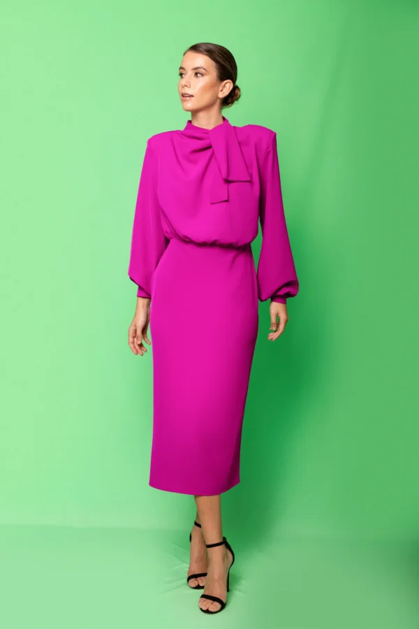 Vestido de fiesta midi con lazada al cuello confeccionado en un crepe fluido de tonos rojo, rosa palo y fucsia. Un vestido muy versátil ideal para eventos de día, haciendo efecto dos piezas con su cuerpo ablusado y su falda lápiz. Escote cerrado con lazada y manga larga abullonada con puños.
