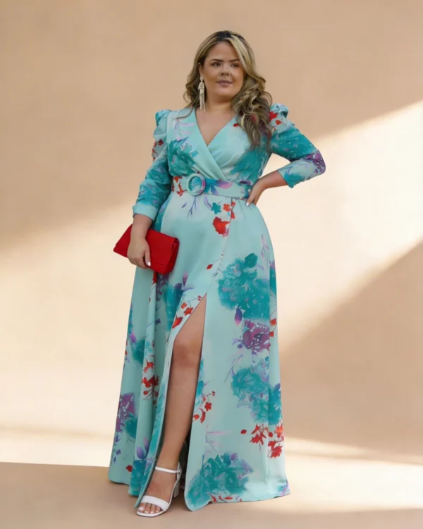 Vestido largo estampado en verdes con falda de vuelo confeccionado en crepe de base verde agua. Flores estampadas en tonos turquesa, rojos y violetas. Escote cruzado con manga larga abullonada decorada con botones forrados, falda de capa con bolsillos y abertura sobre la pierna izquierda. Cinturón forrado con la misma tela. El vestido ideal para ser la invitada perfecta, su hechura sienta bien a todo tipo de cuerpos.