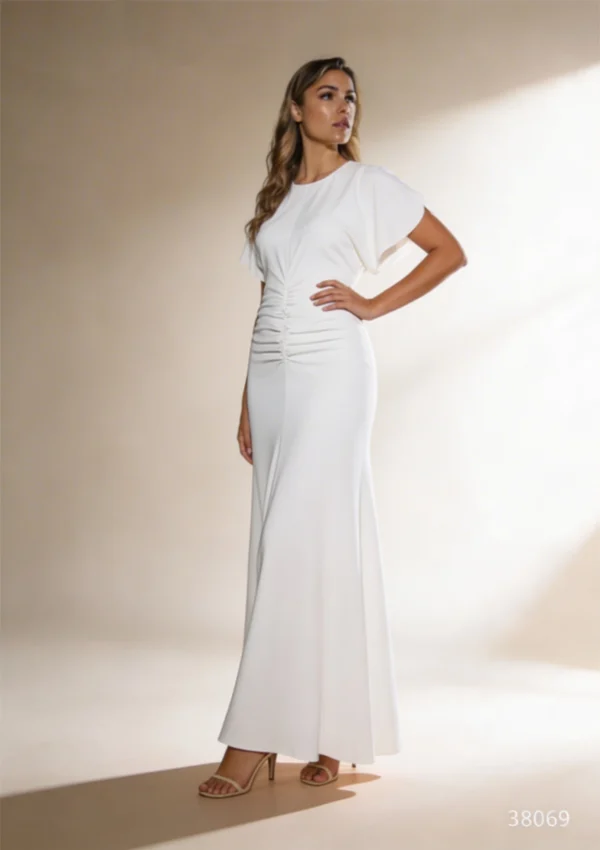 Vestido largo tobillero en tono blanco con diseño fluido y detalle fruncido en la zona central que estiliza la silueta. Su caída ligera y el largo al tobillo aportan un aire elegante pero actual, ideal para eventos donde se busca sofisticación sin rigidez.