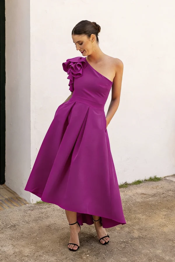 Vestido midi asimétrico con tablas buganvilla confeccionado en crepe. Un top ventas que sienta de maravilla a cualquier talla, con escote asimétrico con un tirante, decorado con volantes, espalda cerrada con cremallera y una bonita falda asimétrica de tablas. El cuerpo de este vestido de fiesta midi asimétrico con tablas se ajusta a pecho y cintura estilizando el cuerpo con unas bonitas tablas que no añaden mucho volumen. La falda es más corta por delante que por detrás, añadiendo un plus de comodidad con unos bolsillos. ¡Cómpralo ya antes de que se agote! Es uno de los mejores vestidos que podrás encontrar