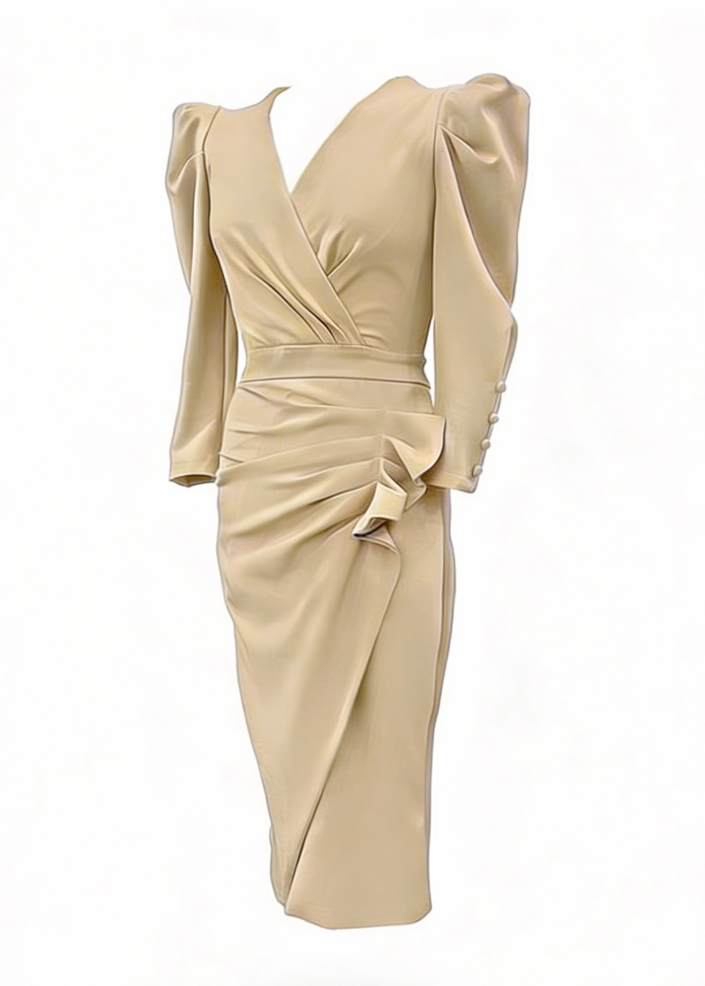 Vestido midi beige con escote cruzado y drapeado lateral