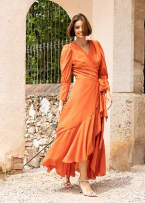 Vestido midi estampado en tonos azul marino y rosa, con escote cruzado y cinturón que define la cintura y realza la silueta. Su falda con vuelo aporta movimiento y comodidad, convirtiéndolo en una opción favorecedora y versátil para invitadas que buscan un look elegante con personalidad.