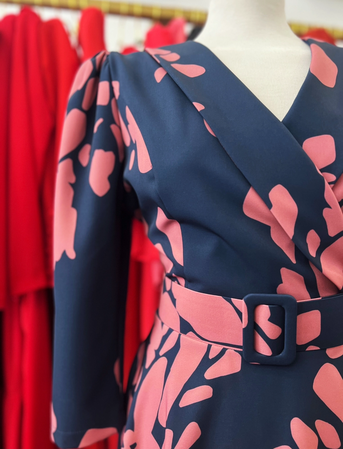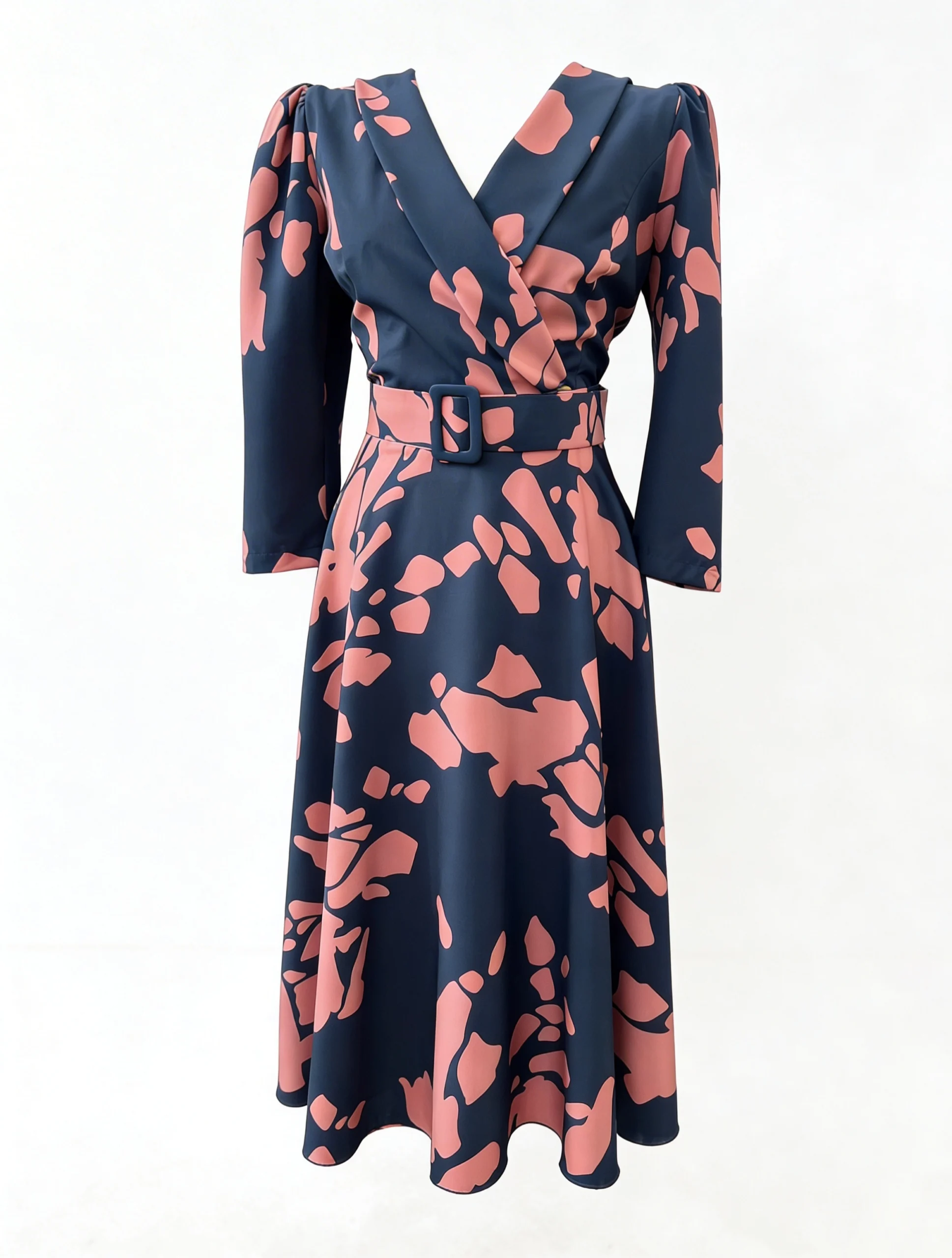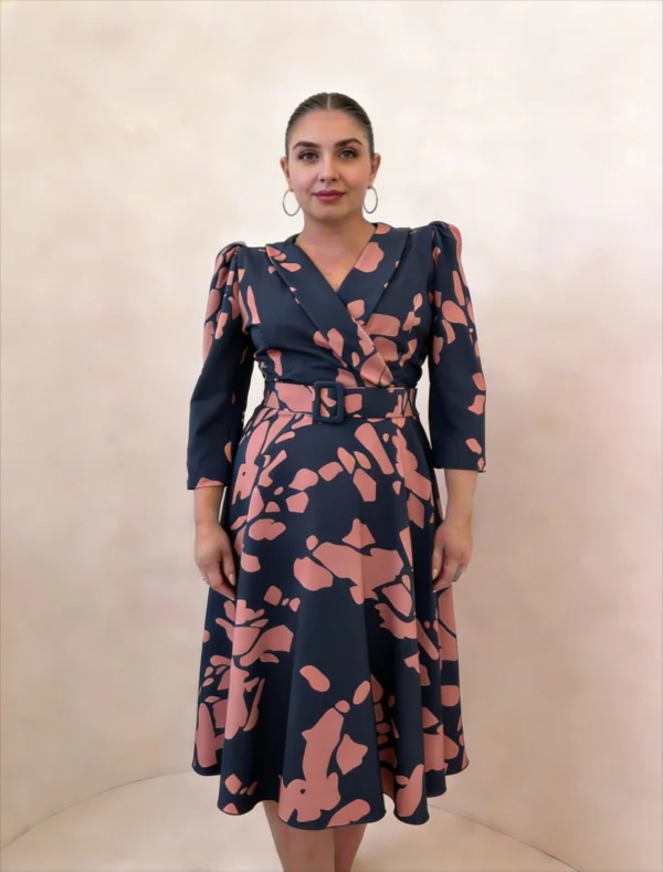 Vestido midi estampado en tonos azul marino y rosa, con escote cruzado y cinturón que define la cintura y realza la silueta. Su falda con vuelo aporta movimiento y comodidad, convirtiéndolo en una opción favorecedora y versátil para invitadas que buscan un look elegante con personalidad.