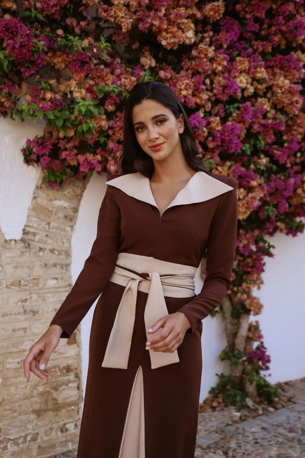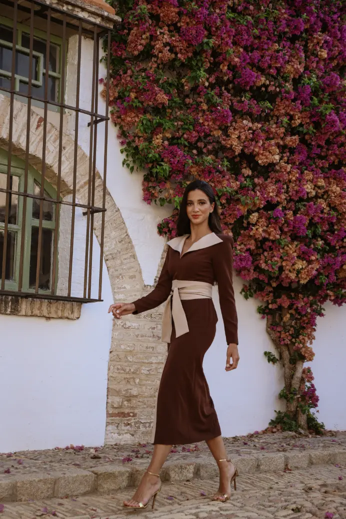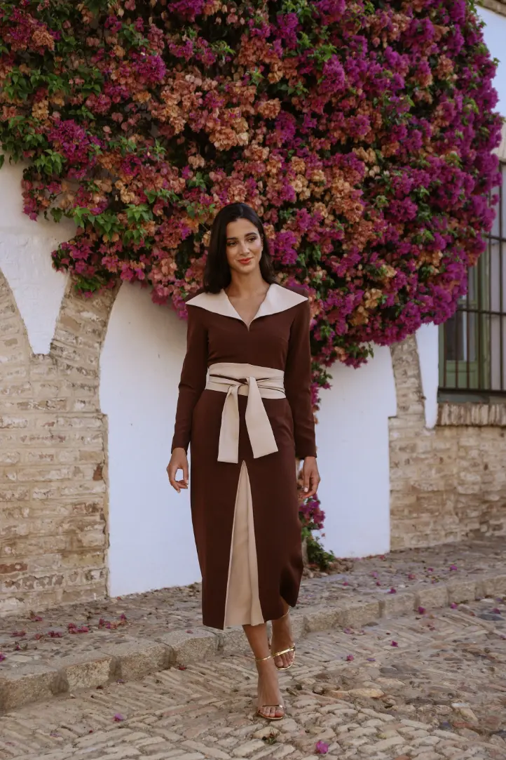 Vestido midi marrón con cuello solapa beige confeccionado en crepe. Vestido con manga larga, cuello pico del que salen dos solapas en pico y espalda cerrada. Su falda recta dispone de una abertura delantera con beige de fondo. Fajin ancho de doble vuelta con base beige a juego que realza tu figura.
