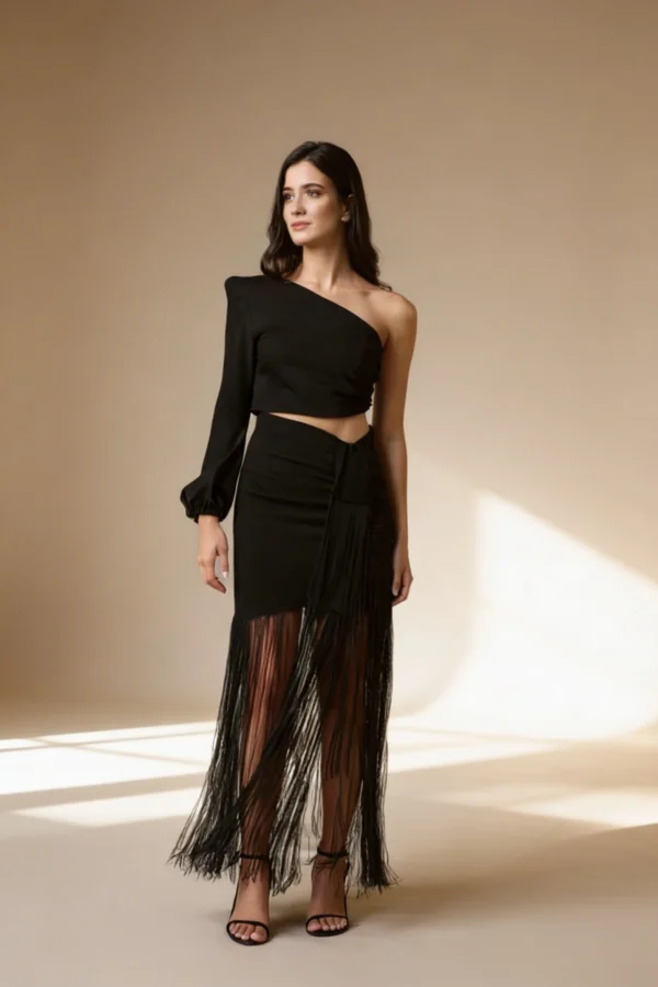 Vestido negro con flecos largos confeccionado en crepe fluido. Vestido efecto top y falda, unidos en la parte derecha. Cuerpo asimétrico, con manga larga en el brazo derecho, con puño de goma abullonado, cierre de botones negros en la parte izquierda. Falda cruzada ajustada con bajo de flecos hasta el tobillo en el mismo tono. Detalle de caída anudada en la parte izquierda con flecos como la falda
